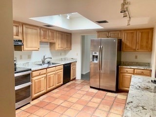 Charming 3 bed/2bath end unit with saltillo tile in entrance, hallway ,baths & kitchen Backyard has lovely brick patio. Built in cabinets in 2 car garage.